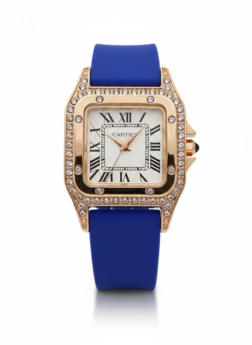 Elevate your style with this elegant Cartier-inspired wristwatch, designed for those who appreciate luxury and sophistication. The watch features a square dial with classic Roman numerals and a beautifully textured face that adds depth and charm. The rose-gold toned case is adorned with sparkling crystal stones, giving it a glamorous and premium look.