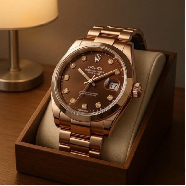 The warm brown sunburst dial is accented with crystal-set hour markers that sparkle beautifully under light, adding a premium jewelry-grade finish. A date window at the 3-o’clock position provides both style and everyday practicality, framed with a magnifying lens for easy reading.