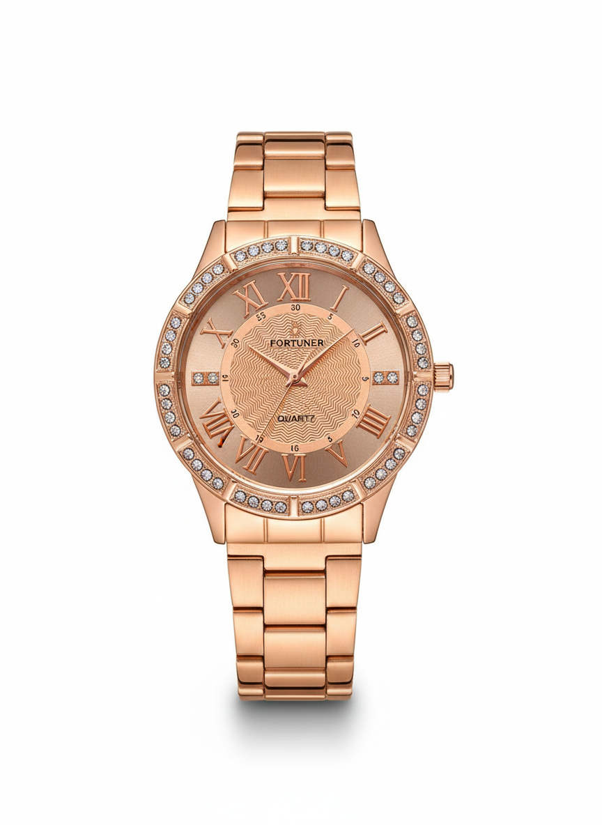 The bezel is surrounded by carefully set sparkling crystals that add brilliance and catch the light from every angle, making this watch a standout accessory for both daytime and evening wear. Its polished rose gold metal case and matching bracelet give it a rich, premium finish while ensuring durability and long-lasting beauty.