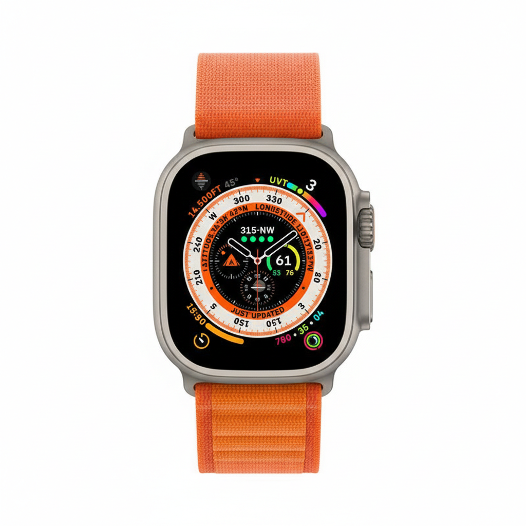 This premium smartwatch is a masterpiece of engineering and luxury, designed for those who demand peak performance without sacrificing style. It features a bold, satin-finished gold titanium chassis paired with a sophisticated charcoal trail loop, creating a high-contrast look that stands out in any environment.Design & Build QualityPrecision-Crafted Case: The watch is encased in an aerospace-grade gold-toned metal body, featuring a flat sapphire crystal face and a protective raised bezel for maximum durability.Advanced Control System: Includes a high-tactility Digital Crown with a distinctive orange accent and a flush-mounted side button for seamless navigation.Performance Band: The breathable, lightweight woven strap is designed for all-day comfort, featuring adjustable high-strength lugs for a secure, custom fit.The "Wayfinder" DisplayUltra-Bright Retina Display: An Always-On OLED screen that remains visible even under direct sunlight.Multi-Metric Watch Face: A specialized interface that includes:Live Navigation: Built-in compass and GPS coordinates.Health Tracking: Real-time heart rate monitoring and activity rings.Environment Alerts: Temperature, elevation, and sunset tracking.Technical SpecificationsFeatureDetailsCase MaterialGold-Ionized Titanium / Stainless SteelGlass TypeScratch-Resistant Sapphire CrystalWater Resistance100m (suitable for high-speed water sports)Battery LifeMulti-day endurance with Fast ChargingSensorsECG, SpO2, Altimeter, and Depth GaugeWho is it for?The Modern Professional: A luxury timepiece that integrates perfectly with a digital lifestyle.The Global Traveler: Dual-time zone capabilities and robust navigation tools.The Athlete: Advanced training metrics and a rugged design that survives the toughest workouts.